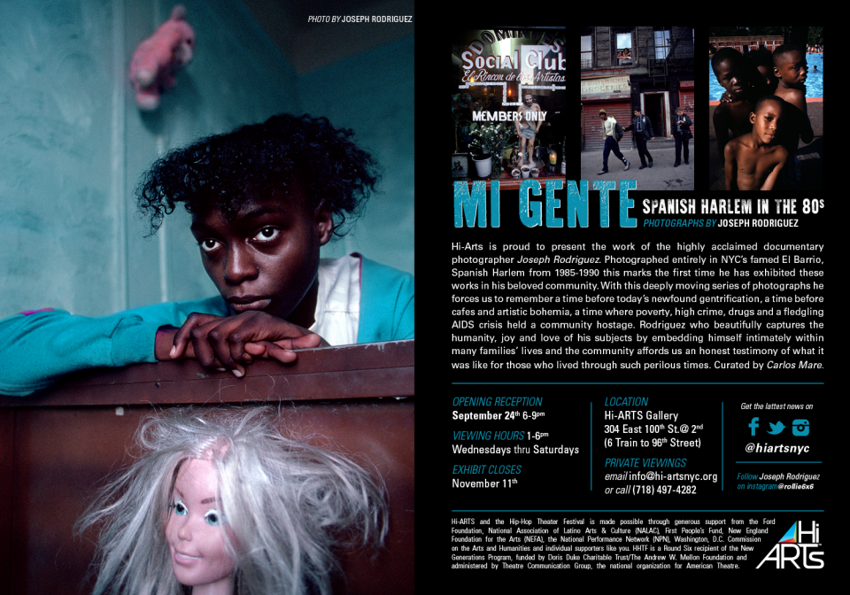Hi-ARTS is proud to present the work of the highly acclaimed documentary photographer Joseph Rodriguez. Photographed entirely in NYC’s famed El Barrio, Spanish Harlem from 1985-1990 this marks the first time he has exhibited these works in his beloved community. With this deeply moving series of photographs he forces us to remember a time before today’s newfound gentrification, a time before cafes and artistic bohemia, a time where poverty, high crime, drugs and a fledgling AIDS crisis held a community hostage. Rodriguez who beautifully captures the humanity, joy and love of his subjects by embedding himself intimately within many families’ lives and the community affords us an honest testimony of what it was like for those who lived through such perilous times. Curated by Carlos Mare.