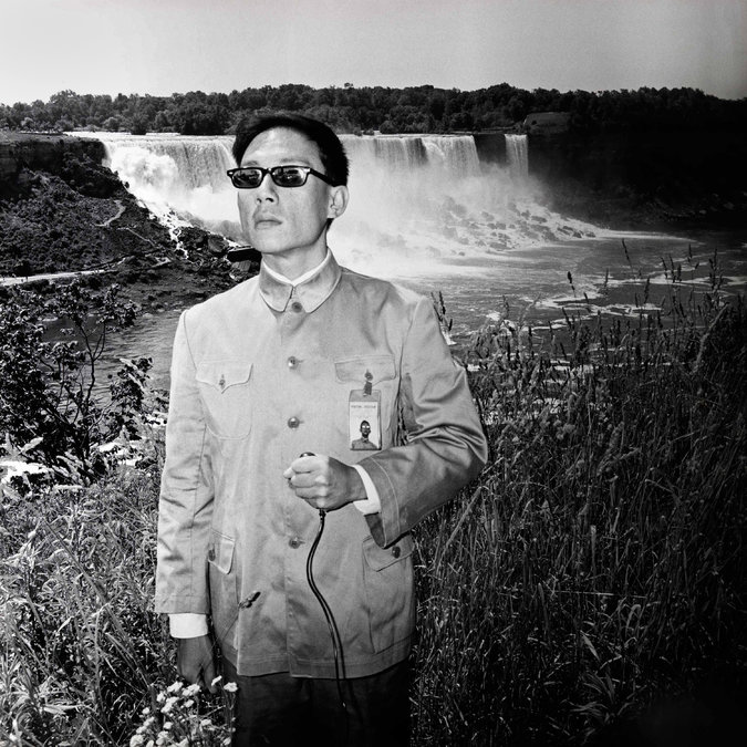 In 1979 Tseng Kwong Chi began to create his most memorable works: two photographic series, “East Meets West” and its follow-up, “Expeditionary Series,” in which he appeared in dark glasses and a Zhongshan suit, the uniform favored by Mao Zedong. Thus outfitted, he posed in front of famous monuments like Mount Rushmore and the Eiffel Tower and natural wonders like Niagara Falls and the Canadian Rockies.